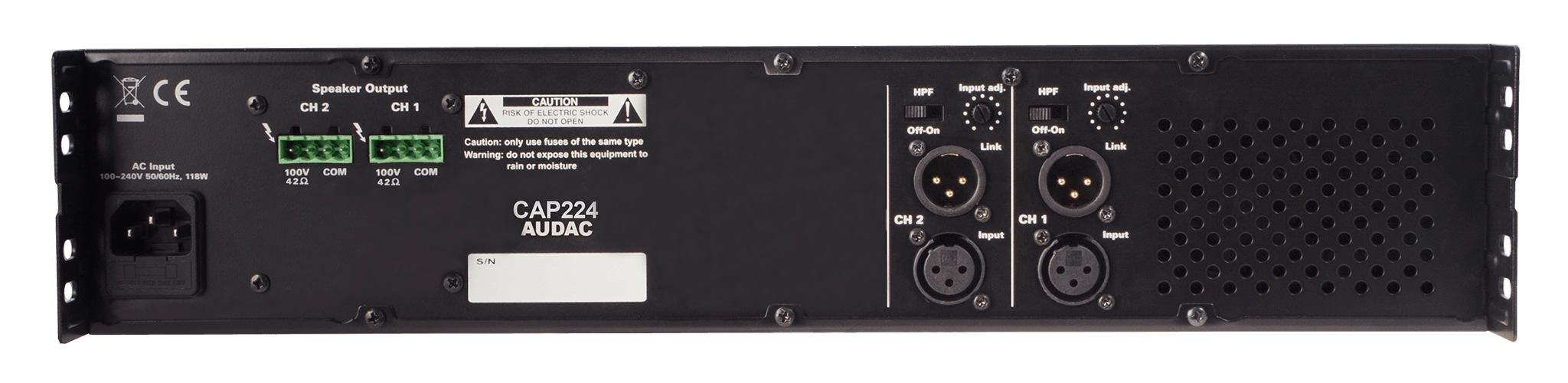 La série CAP propose des amplificateurs de puissance multicanaux professionnels 100 V. Le CAP224 offre deux canaux et une puissance de sortie de 240 W. Il offre ainsi une solution flexible pour les systèmes de distribution audio multizones avec deux zones indépendantes. Conçus pour être simples d’utilisation, ces amplificateurs ne comportent que les commandes et les connexions nécessaires, ce qui simplifie grandement l’utilisation et l’installation. Leur rendement et leur fiabilité élevés sont assurés par l’utilisation d’alimentations à découpage combinées à une technologie d’amplification de classe D