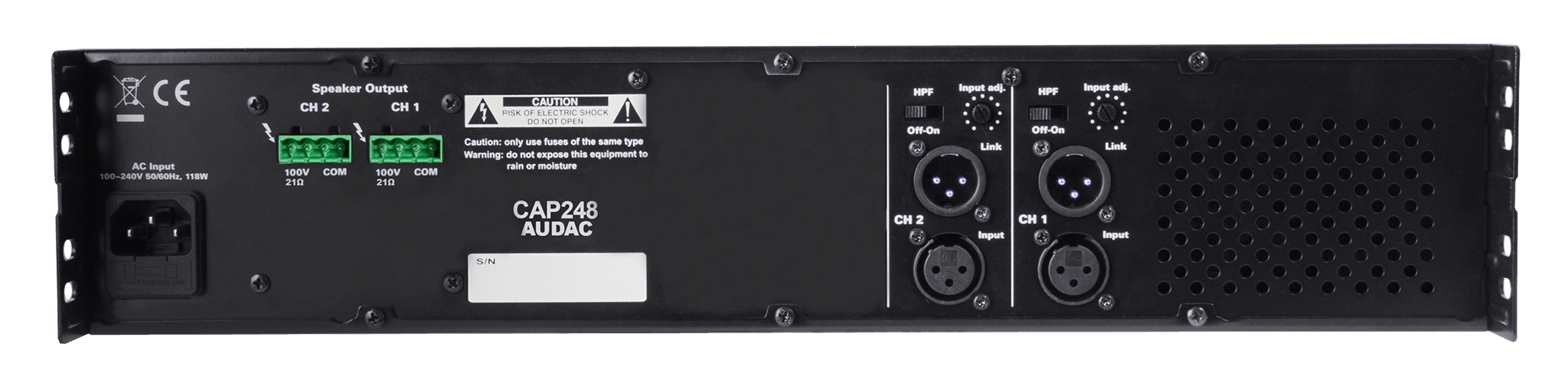 La série CAP propose des amplificateurs de puissance multicanaux professionnels 100 V. Le CAP248 offre deux canaux et une puissance de sortie de 480 W. Il offre ainsi une solution flexible pour les systèmes de distribution audio multizones avec deux zones indépendantes. Conçus pour être simples d’utilisation, ces amplificateurs ne comportent que les commandes et les connexions nécessaires, ce qui simplifie grandement l’utilisation et l’installation. Leur rendement et leur fiabilité élevés sont assurés par l’utilisation d’alimentations à découpage combinées à une technologie d’amplification de classe D